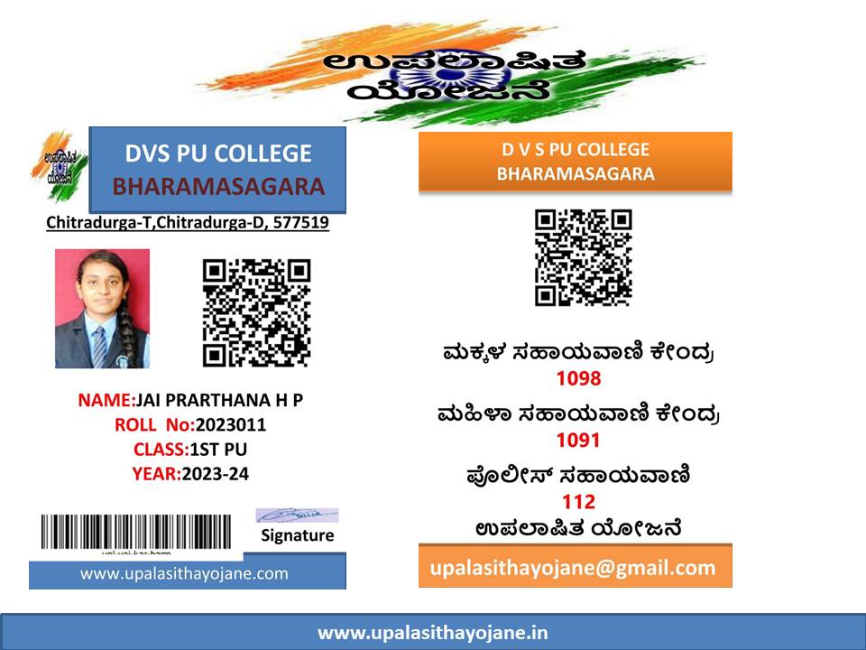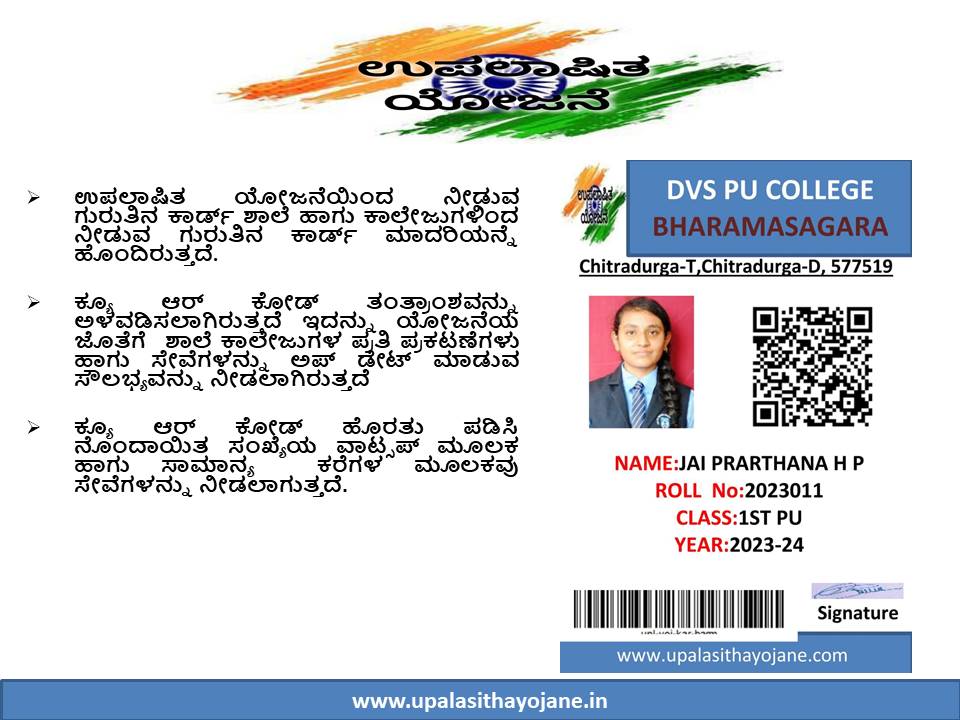 ಉಪಲಾಷಿತ ಯೋಜನೆಯಿಂದ ನೀಡುವ ಗುರುತಿನ ಕಾರ್ಡ್ ಶಾಲೆ ಹಾಗು ಕಾಲೇಜುಗಳಿಂದ ನೀಡುವ ಗುರುತಿನ ಕಾರ್ಡ್ ಮಾದರಿಯನ್ನೆ ಹೊಂದಿದ್ದು ಕ್ಯೂ ಆರ್ ಕೋಡ್ ತಂತ್ರಾಂಶವನ್ನು ಅಳವಡಿಸಲಾಗಿರುತ್ತದೆ ಇದನ್ನು ಯೋಜನೆಯ ಜೊತೆಗೆ ಶಾಲೆ ಕಾಲೇಜುಗಳ ಪ್ರತಿ ಪ್ರಕಟಣೆಗಳು ಹಾಗು ಸೇವೆಗಳನ್ನು ಅಪ್ ಡೇಟ್ ಮಾಡುವ ಸೌಲಭ್ಯವನ್ನು ನೀಡಲಾಗಿರುತ್ತದೆ ಮತ್ತು ಕ್ಯೂ ಆರ್ ಕೋಡ್ ಹೊರತು ಪಡಿಸಿ ನೊಂದಾಯಿತ ಸಂಖ್ಯೆಯ ವಾಟ್ಸಪ್ ಮೂಲಕ ಹಾಗು ಸಾಮಾನ್ಯ ಕರೆಗಳ ಮೂಲಕವು ಸೇವೆಗಳನ್ನು ನೀಡಲಾಗುತ್ತದೆ.