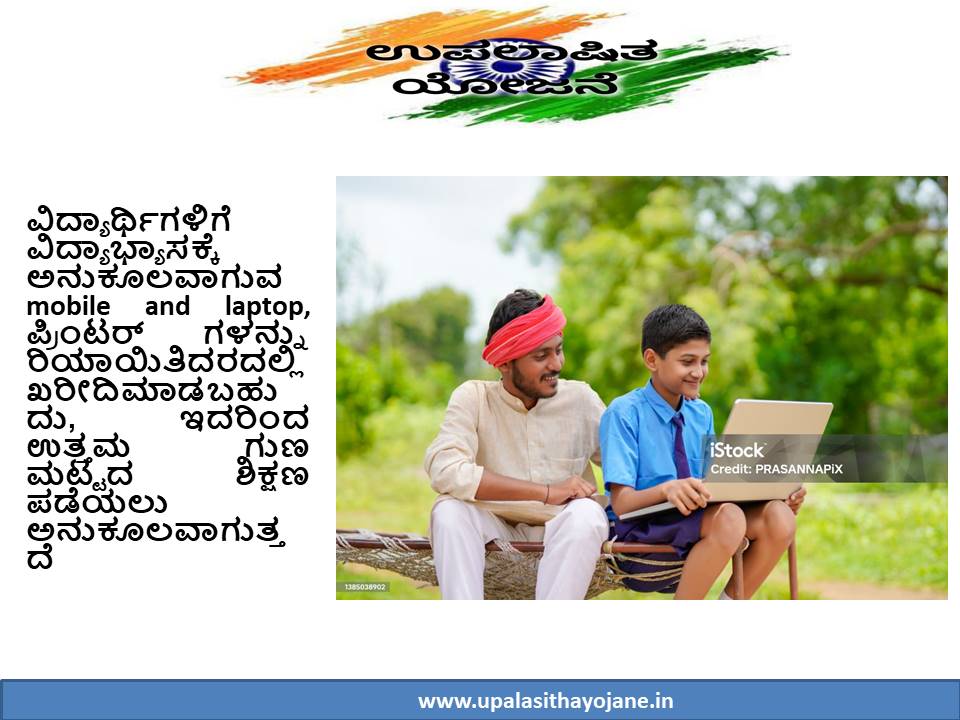 - ಉನ್ನತ ವಿದ್ಯಾಭ್ಯಾಸ ಉದ್ದೇಶಕ್ಕೆ, ವಿದ್ಯಾರ್ಥಿಯ ಪ್ರತಿಭೆ ಹಾಗು ಆಶಕ್ತಿ ಕ್ಷೇತ್ರಗಳಲ್ಲಿತೊಡಗಿಕೊಳ್ಳುವುದಕ್ಕೆ, ಶೈಕ್ಷಣಿಕ ಉದ್ದೇಶಕ್ಕೆ ಮೋಬೈಲ್ ಇತರೆ ಎಲೆಕ್ಟ್ರಿಕ್ ವಸ್ತು ಖರೀದಿಗೆ ಮತ್ತು ಲ್ಯಾಪ್ ಟಾಪ್/ ಡೆಸ್ಕ್ ಟಾಪ್ ಖರೀದಿಗೆ ನೀಡುವ ರಿಯಾಯಿತಿ ಹಾಗು ಸಹಾಯ ಧನದ ಮಾಹಿತಿಯನ್ನು ಯೋಜನೆಯ ಮೂಲಕ ನೀಡಲಾಗುತ್ತದೆ.